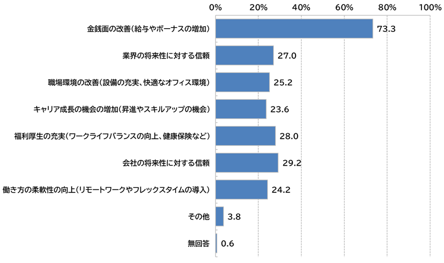 “今後、何を改善すれば現在の職場でより働き続けたいと考えますか”の設問では、【金銭面の改善(給与やボーナスの増加)(73.3%)】を求める意見が多く見られた。