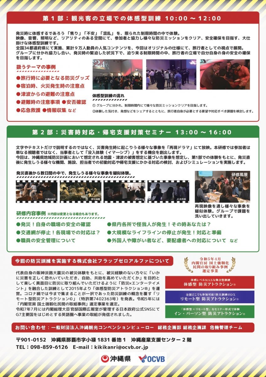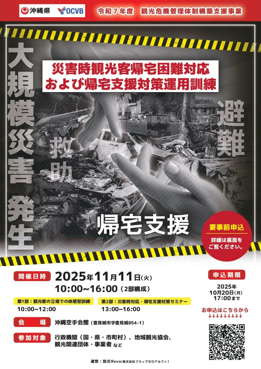 一般財団法人沖縄観光コンベンションビューロー(OCVB)は、沖縄県より観光危機管理体制構築支援事業を受託しており、災害・危機発生時における観光客の早期帰宅を実現すべく、災害時における各主体のオペレーション、関係機関相互の連携を強化し、現場における対応力の向上を目的として、下記のとおり図上訓練を実施します。