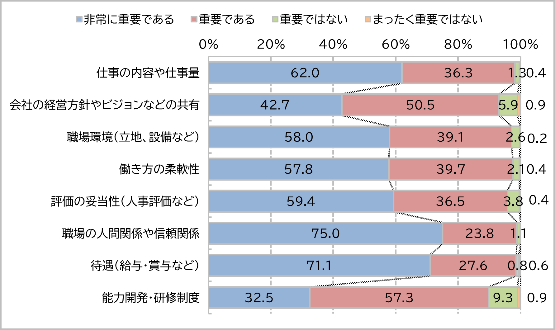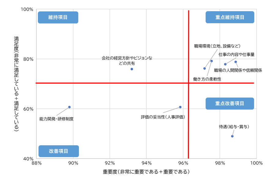 「職場の人間関係や信頼関係」や「仕事の内容や仕事量」、「働き方の柔軟性」、「職場環境(立地、設備など)」といった選択肢では、重要度・満足度ともに高く、満足度の継続的な維持・強化が求められる。