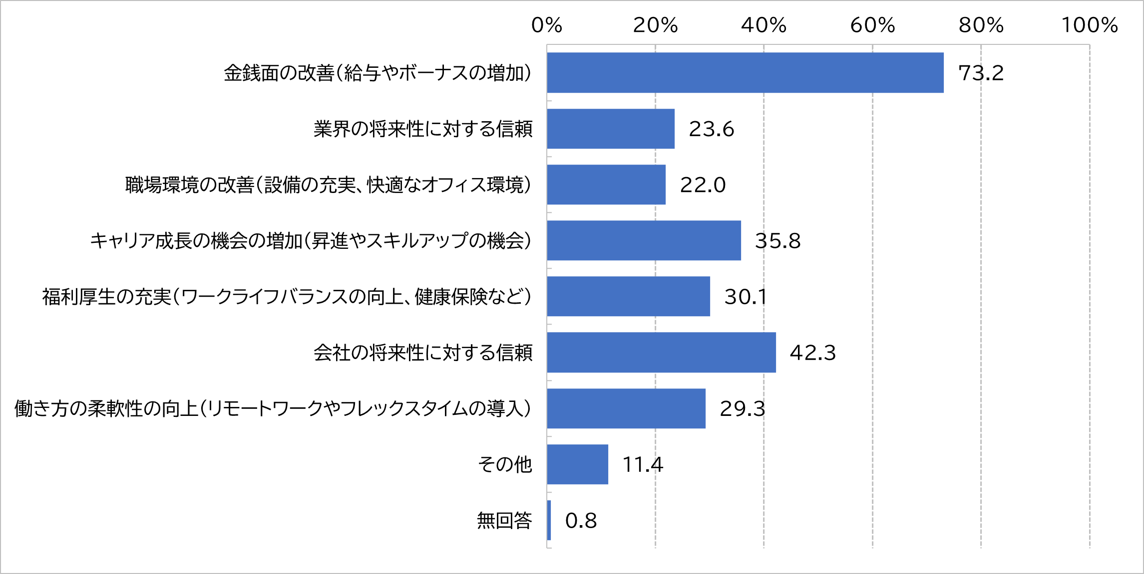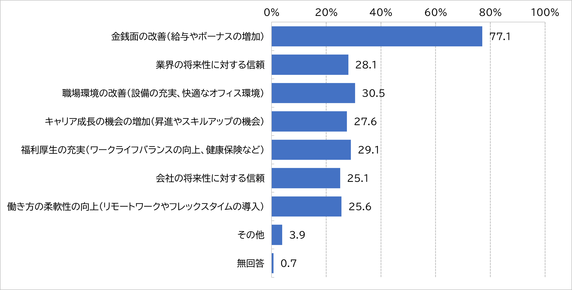 “今後、何を改善すれば今の会社でより働き続けたいと考えますか”の設問では、【金銭面の改善(給与やボーナスの増加)(77.1%)】を求める意見が多く見られた。