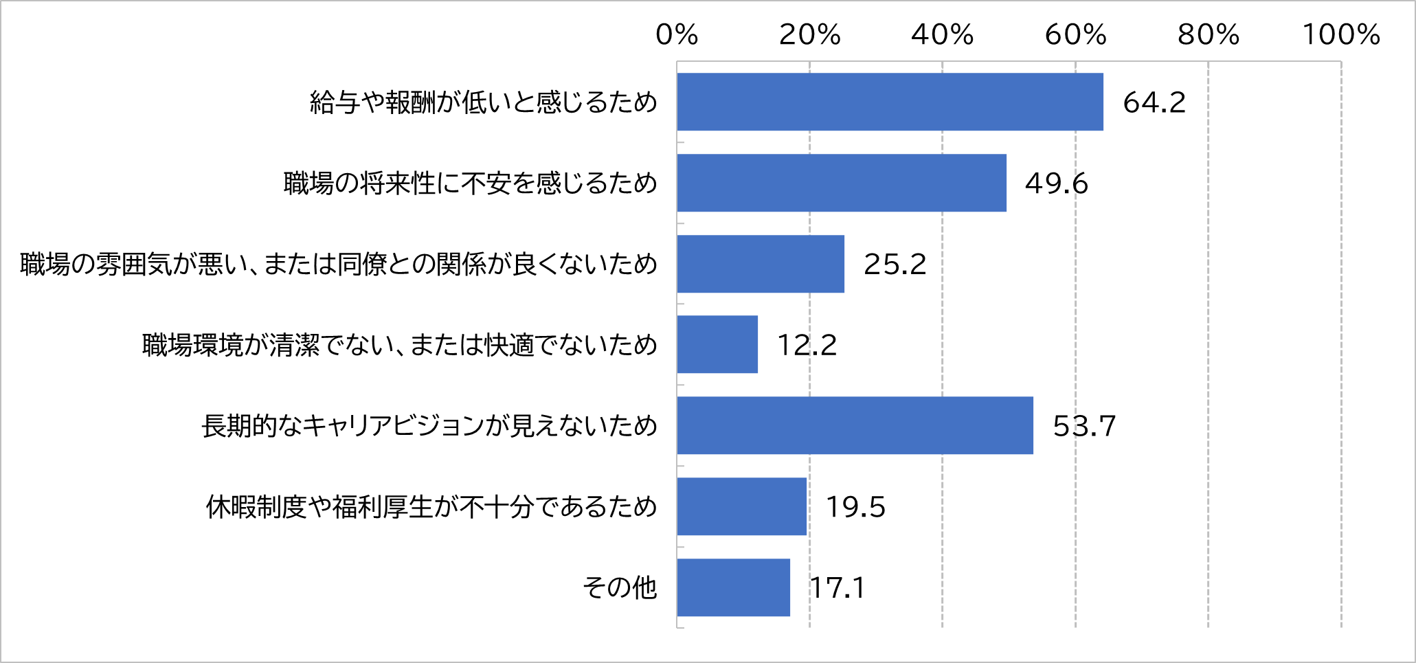 働き続けたくないと回答した従事者について、働き続けたくない理由は【給与や報酬が低いと感じるため(64.2%)】と回答した割合が最も高く、次いで【長期的なキャリアビジョンが見えないため(53.7%)】、【職場の将来性に不安を感じるため(49.6%)】などが続いた。