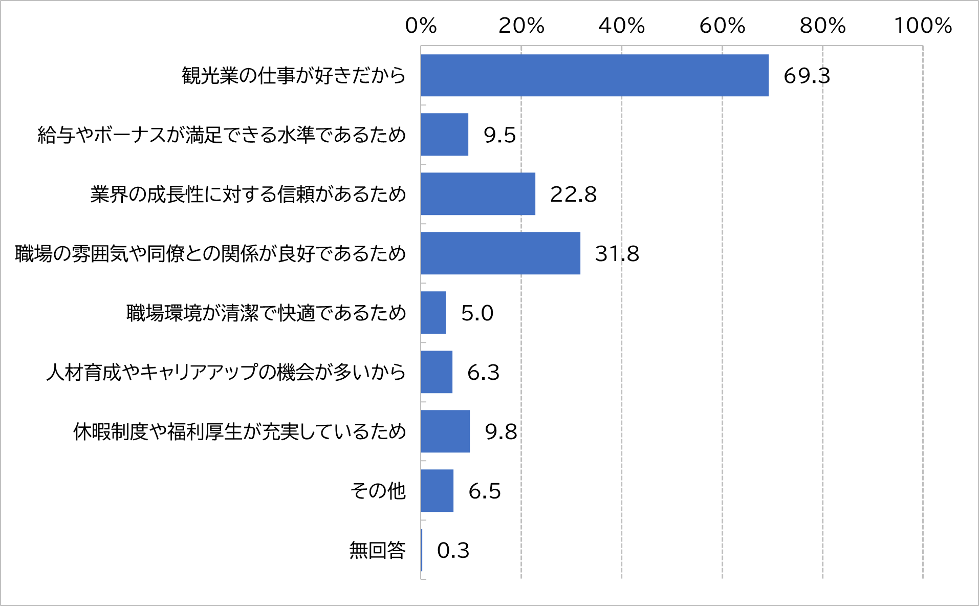 働き続けたい(とてもそう思う+そう思う)と回答した従事者について、働き続けたい理由として【観光業の仕事が好きだから(69.3%)】と回答した割合が最も高い結果となった。