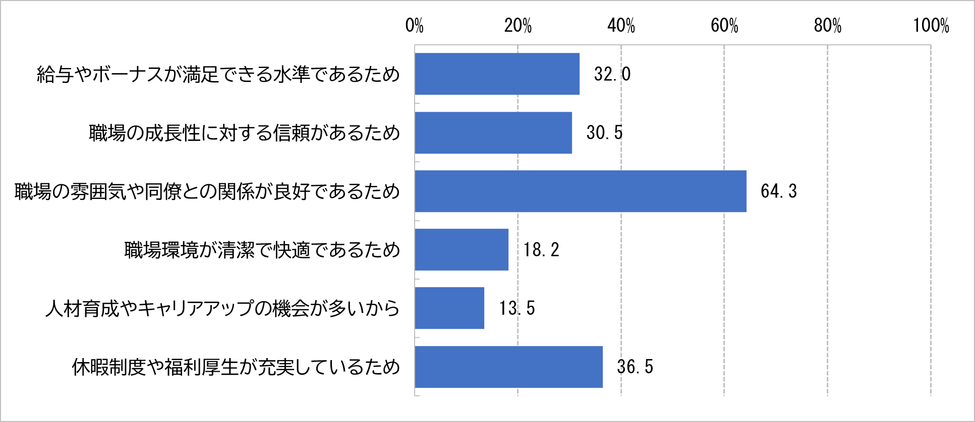 働き続けたいと回答した従事者について、働き続けたい理由として【職場の雰囲気や同僚との関係が良好であるため(64.3%)】との回答が最も多い結果となった。次いで【休暇制度や福利厚生が充実しているため(36.5%)】、【給与やボーナスが満足できる水準であるため(32.0%)】などが続いた。