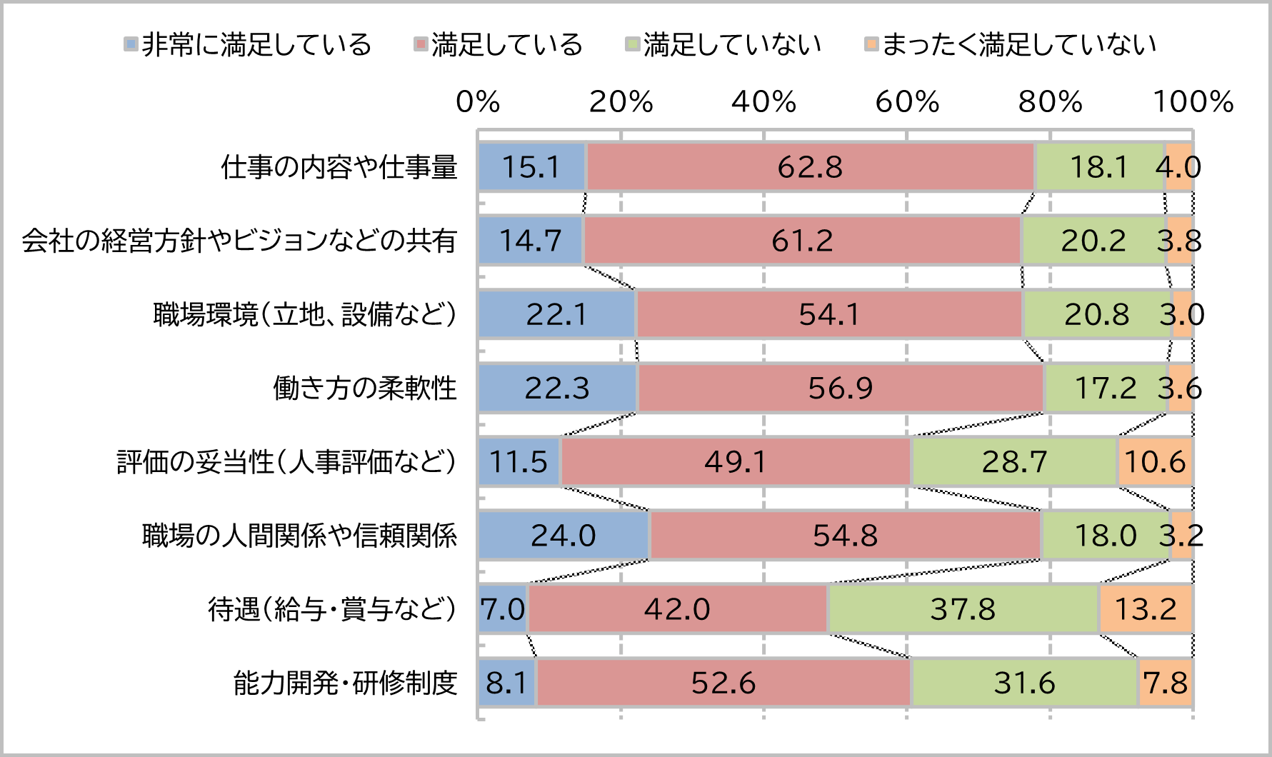 待遇以外にも、「評価の妥当性」「能力開発・研修制度」については、他の項目と比べて満足度が低く、体系的な研修制度や評価基準の見直しを行い、スキルアップの機会をつくることや、定期的に人事評価を実施することで、従業員が自社や業界内で長期的にキャリアを形成できるビジョンを示すことが重要となります。