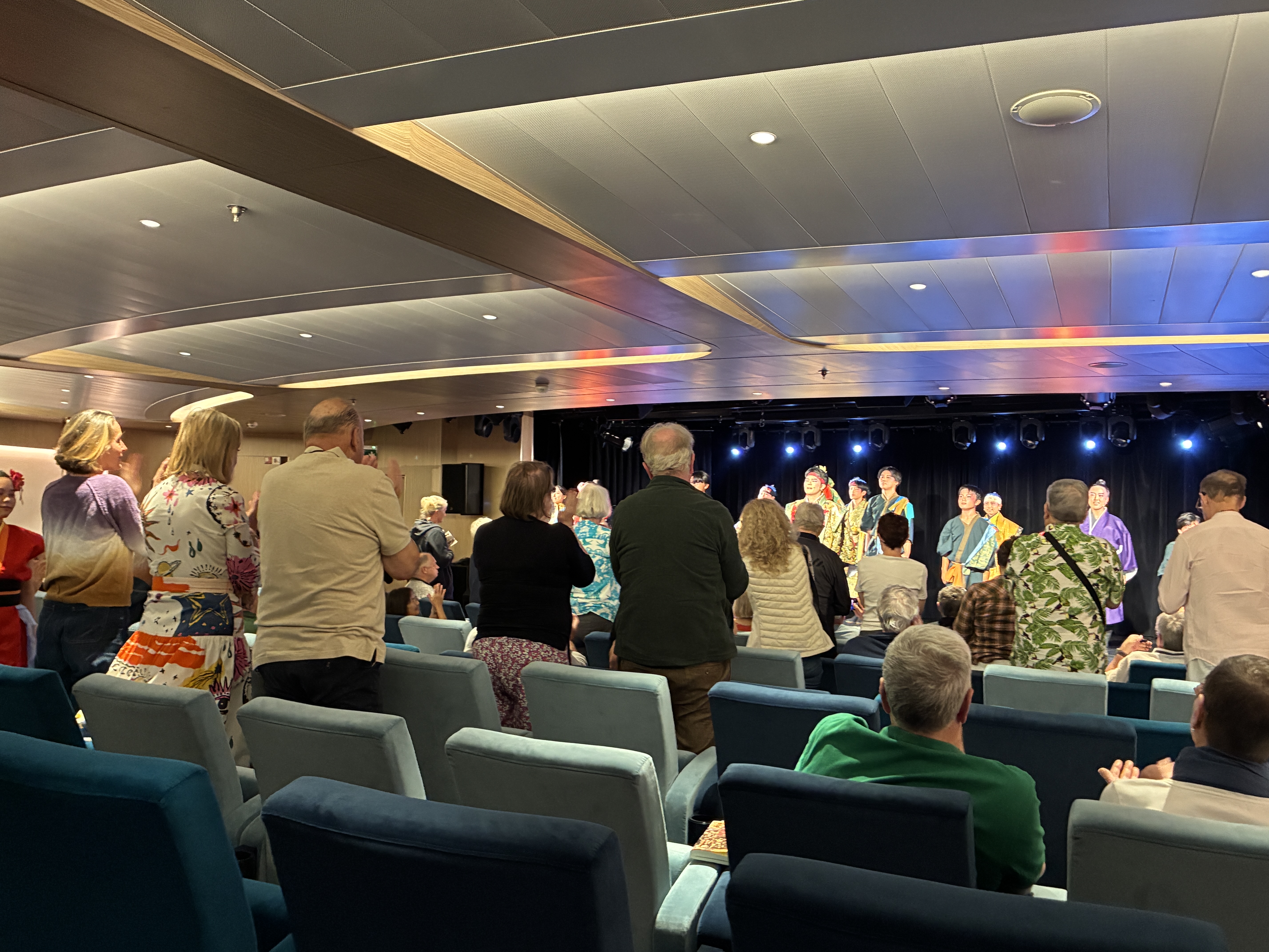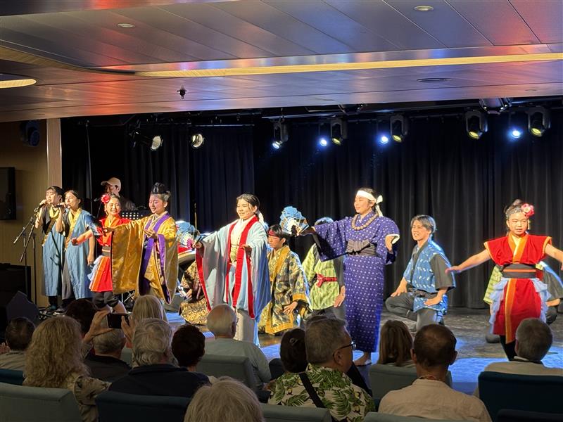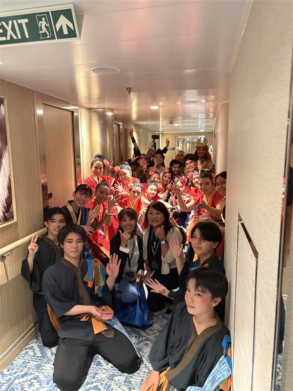 上演当日には乗客約120名のほぼ全員と多くのクルーが船内のメインホールに集まり、生演奏と歌に合わせた迫力ある演舞に見入っており、ホール全体を使った演出により観客の間近でダイナミックな舞台が展開されました。