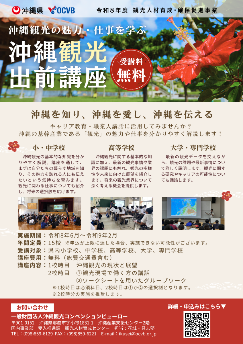 一般財団法人沖縄観光コンベンションビューロー(OCVB)では沖縄県より「令和8年度観光人材育成・確保促進事業」を受託しており、県内の小学校、中学校、高等学校、大学、専門学校を対象に、沖縄観光の知識をはじめ、観光業の現状・課題、観光に関わる仕事についての講話を行う「観光出前講座」を実施いたします。つきましては、出前講座を実施する学校の募集を行います、皆様のご応募をお待ちしております。